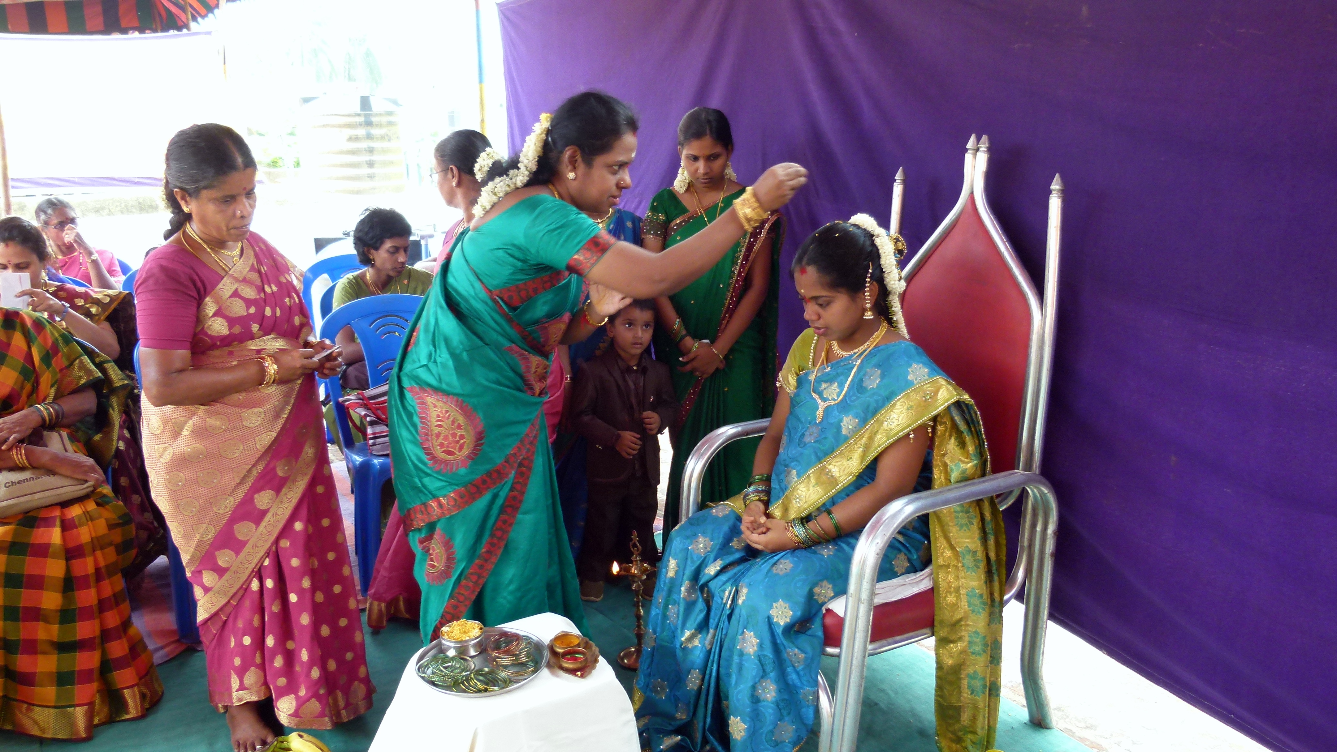 En cette fête de « Republic Day », loin des parades, défilés et discours officiels, les femmes de nos immeubles ont organisé un concours de Kolam. Chacune de équipes participantes s’est vue attribuer la même surface grisâtre de parking pour réaliser son oeuvre éphémère.